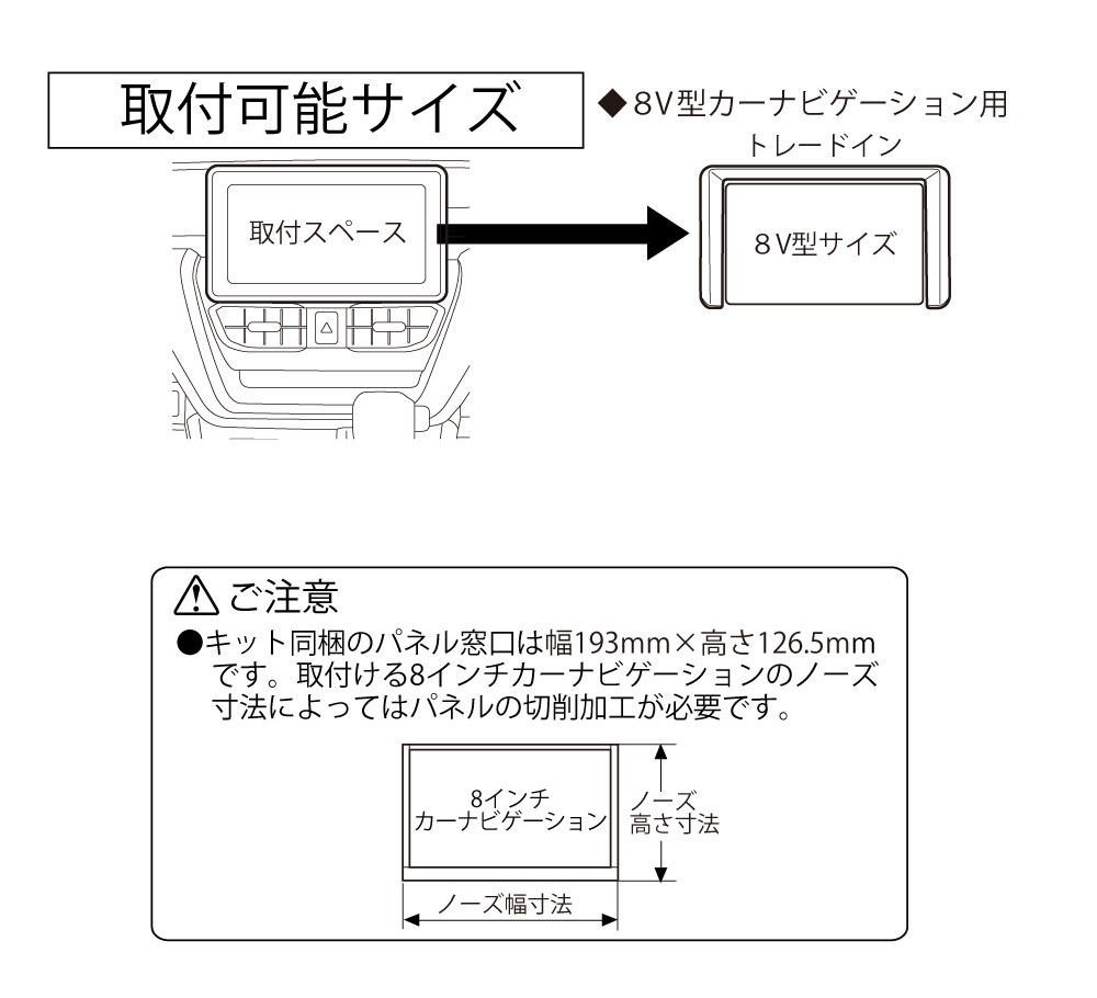200mm窓口付車(オーディオレス車含む)に、市販の8インチカーナビゲーションを取付けるキットです。