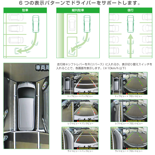今までこの機能が使えるのはメーカーオプションで装着した標準ナビのみでしたが、本商品により、市販ナビに対し全方位駐車アシストの機能を追加する事ができるようになります。前後左右4箇所に取り付けた専用カメラにより俯瞰映像を市販ナビに表示。駐車時や徐行時(10km/h以下)に見落とし易い死角をカバーし、ドライバーをサポートします。